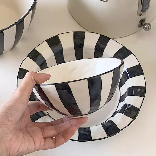 ◆: 商品説明 ………………………………………………… 今、使いたいをカタチにした器 ストライプのデザインとモノトーンがマッチしたテーブルウェア。 デザインは3種類。浅めと深めのフチが選べるラウンドプレートが2種類としっかり深さのあるボウルが1種類。 和洋ジャンルを選ばずどんなお料理にも合わせやすく食卓にアクセントを与えてくれる、優秀なアイテムです。 お気に入りのアクセサリーやアロマオイルなどディスプレイするトレイにもよさそう。おもてなしにも日常使いにもぴったりな器です。 ………………………………………………… 【 ボウルタイプ はこちら 】 https://www.graydogs.net/items/137586871 ………………………………………………… ◆: スペック ………………………………………………… 【 サイズ 】 B(プレート 浅め) 高さ:約4cm 直径:約21cm C(プレート 深め) 高さ:約4.5cm 直径:約21cm 【 素材 】 陶器製 【 配送方法 】 宅配便 【 ご注意点 】 ・ こちらの製品は海外製品のため多少の汚れや小さな傷がある場合がございます。予めご理解の上ご購入いただきますようお願い申し上げます。 ・ やわらかいスポンジでやさしく洗ってください。 ・ 浸け置き洗いや煮沸消毒、食器洗い乾燥機のご使用は避けてください。 ・ 電子レンジのご使用はできません。 ・ 生産時期により、色・サイズ・デザインが多少 異なる場合がございます。予めご理解くださいませ。 ・ 撮影した商品は実際の色味に近づけてはおりますが、ブラウザーやモニターによって色の見え方が異なる場合がございます。 【 商品管理番号:c-za0658 】 【ワード】お皿 おしゃれ 可愛い かわいい 黒 大きい 深め プレート カフェ 北欧 パスタ カレー 大鉢 食器 大皿 深皿 煮物 ボウル