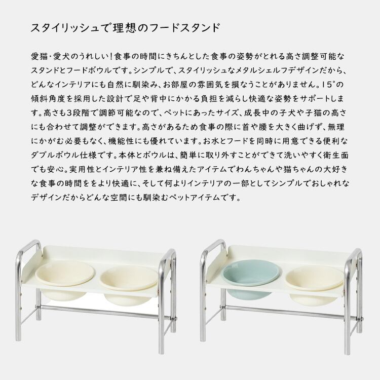 愛猫・愛犬のうれしい!食事の時間にきちんとした食事の姿勢がとれる高さ調整可能なスタンドとフードボウルです。