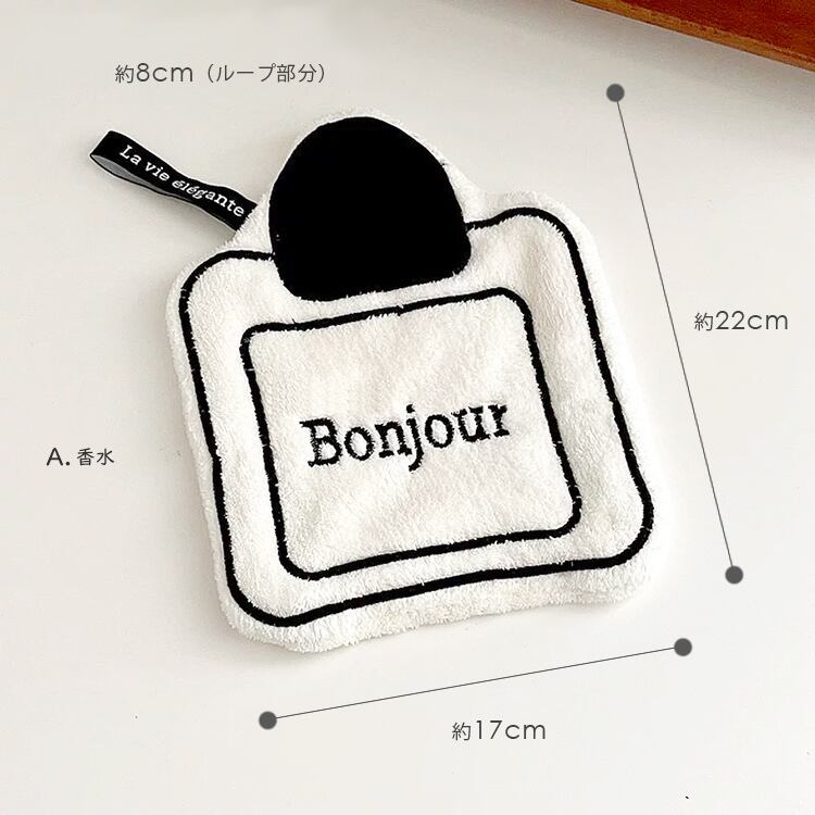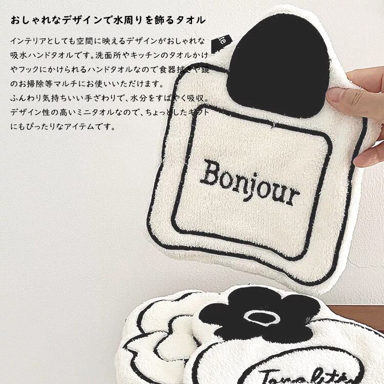 洗面所やキッチンのタオルかけやフックにかけられるハンドタオルなので、食器拭きや鏡のお掃除等マルチにお使いいただけます。