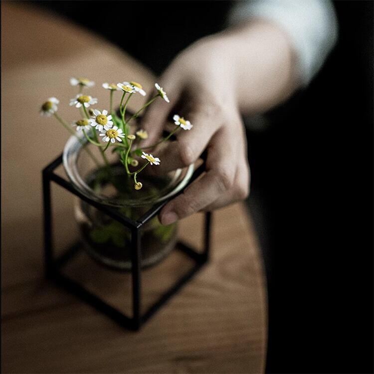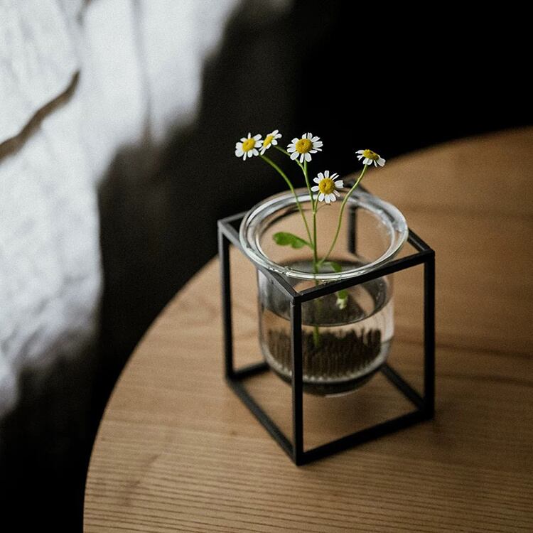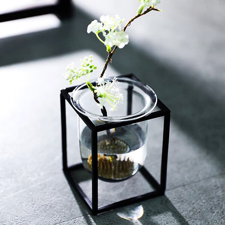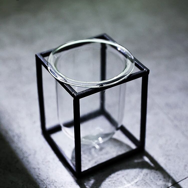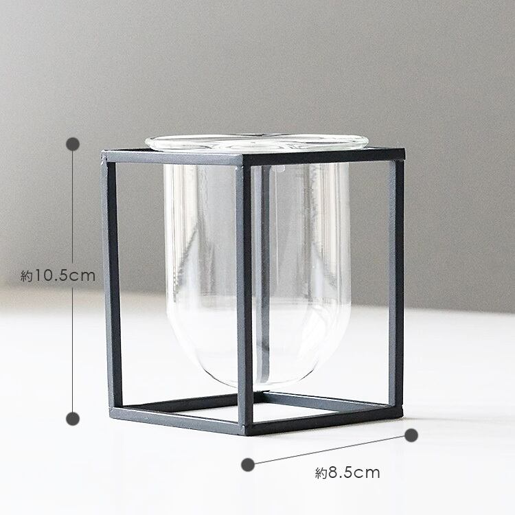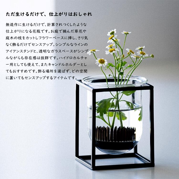 シンプルなラインのアイアンスタンドと、透明なガラスベースがシンプルながらも存在感は抜群です。