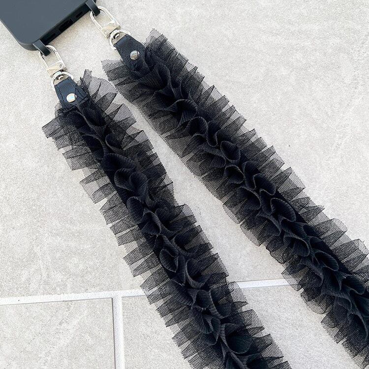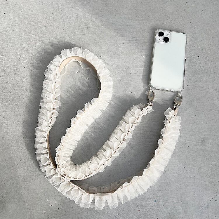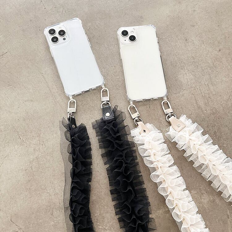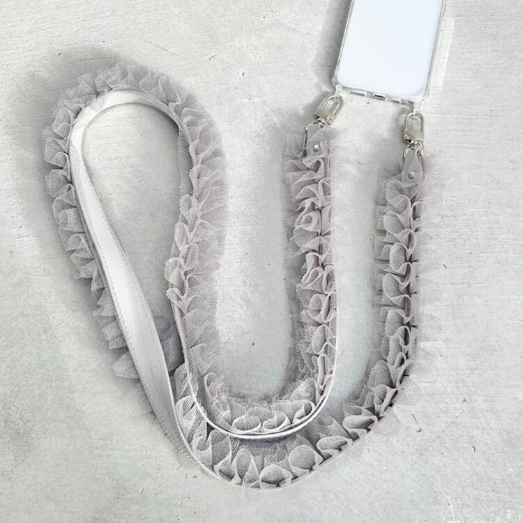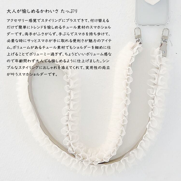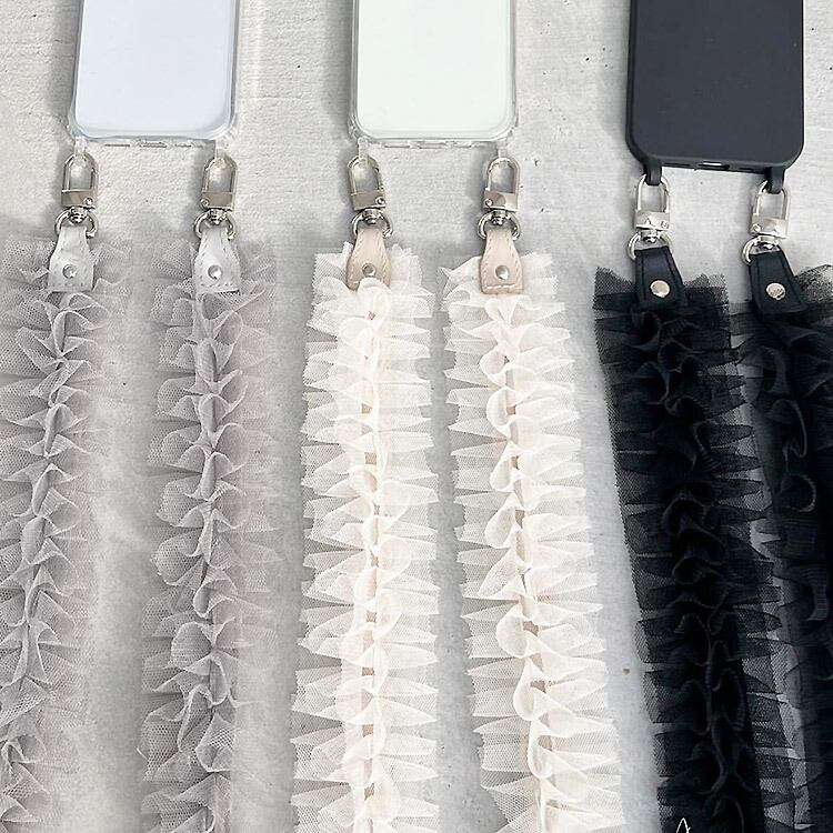 アクセサリー感覚でスタイリングにプラスできて、付け替えるだけで簡単にトレンドを愉しめるチュール素材のスマホショルダーです。