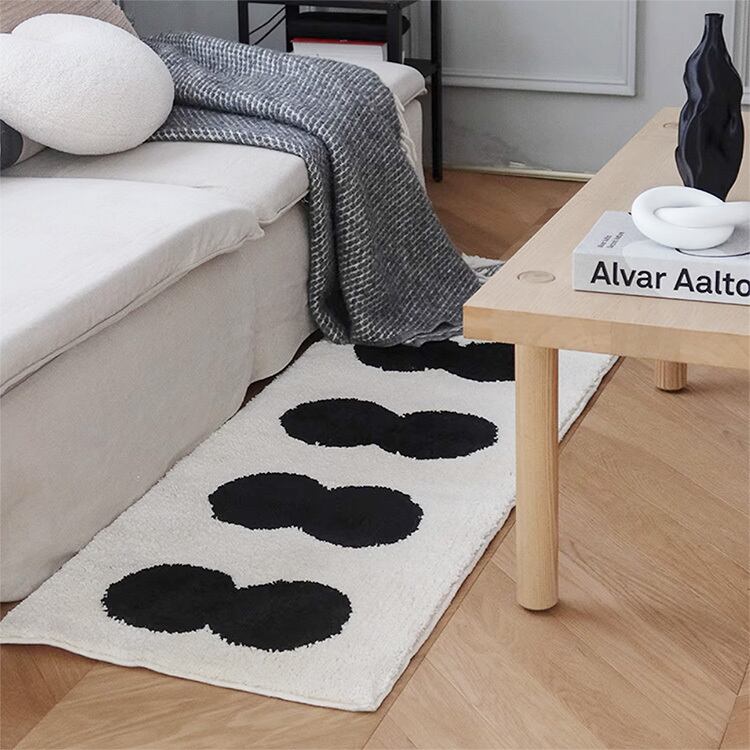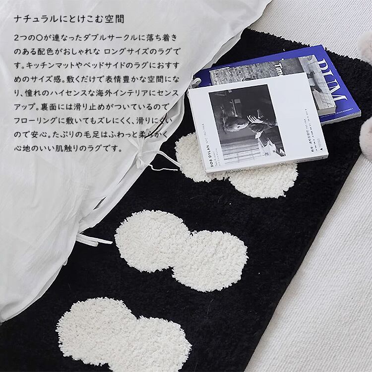 2つの〇が連なったダブルサークルに、落ち着きのある配色がおしゃれな ロングサイズのラグです。
