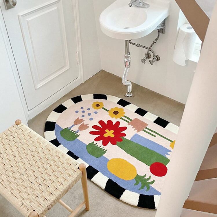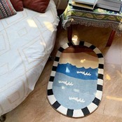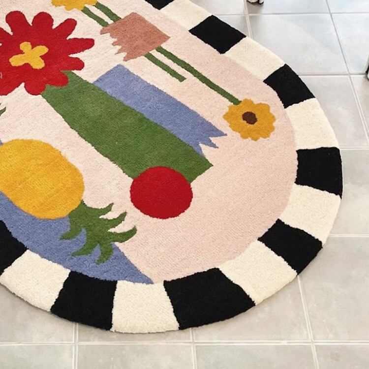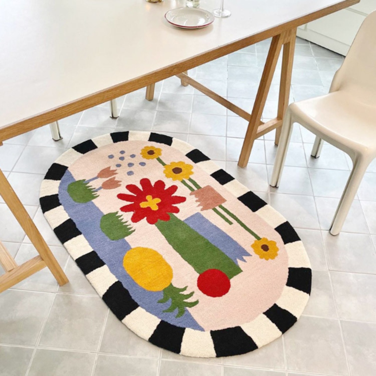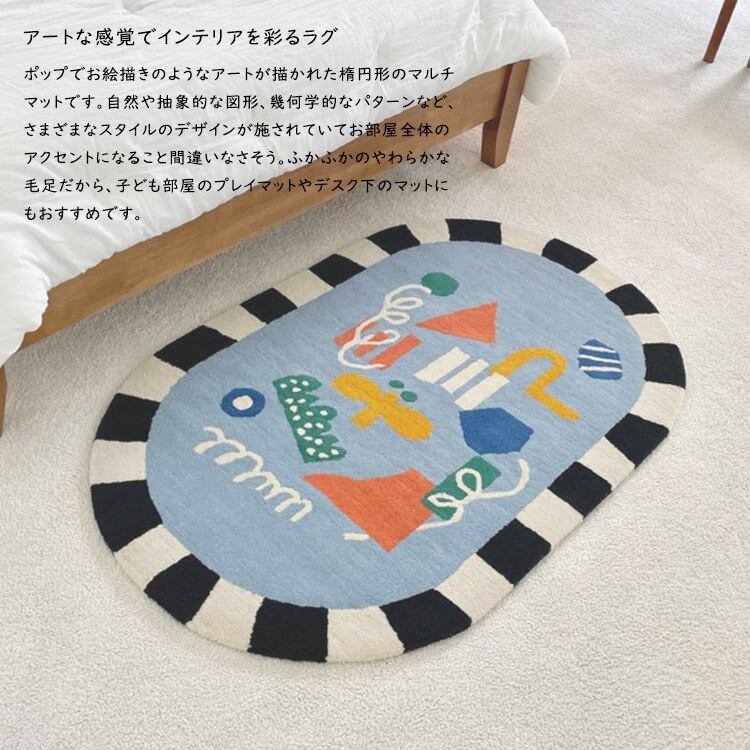 ポップでお絵描きのようなアートが描かれた楕円形のマルチマットです。