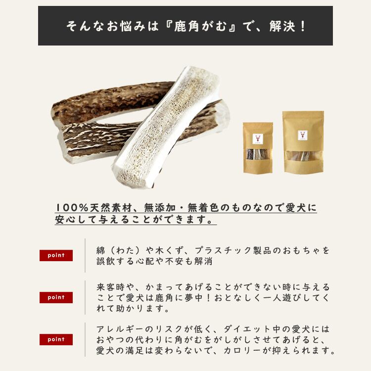 ● アレルギーのリスクが低く、ダイエット中の愛犬にはおやつの代わりに角がむをがしがしさせてあげると、愛犬の満足は変わらないで、カロリーが抑えられます。