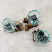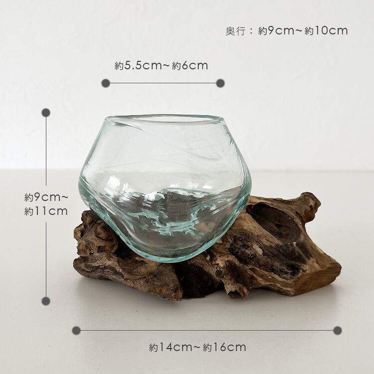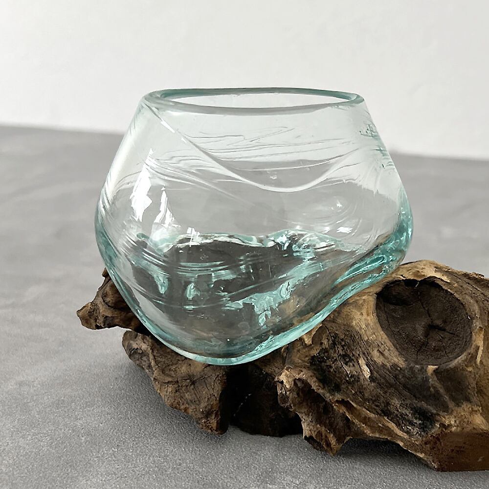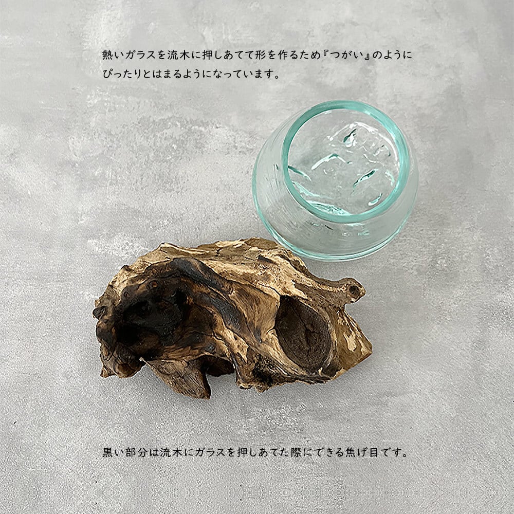 天然の流木そのものの個性を活かした土台と、まるいフォルムのクリアブルーのガラスが組み合わさったマルチに使えるインテリアオブジェです。