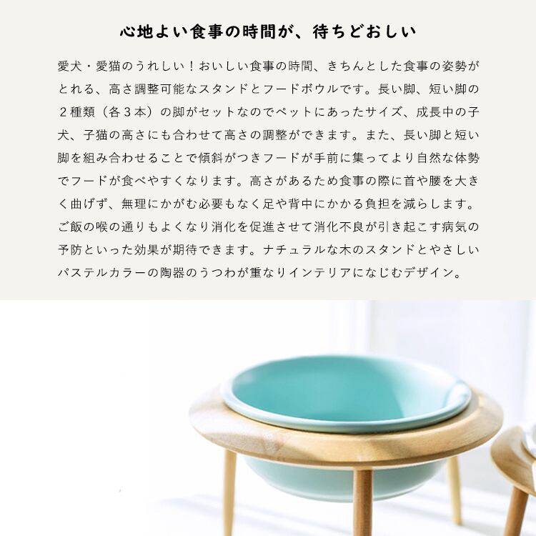 愛犬・愛猫のうれしい!おいしい食事の時間、きちんとした食事の姿勢がとれる、高さ調整可能なスタンドとフードボウルです。