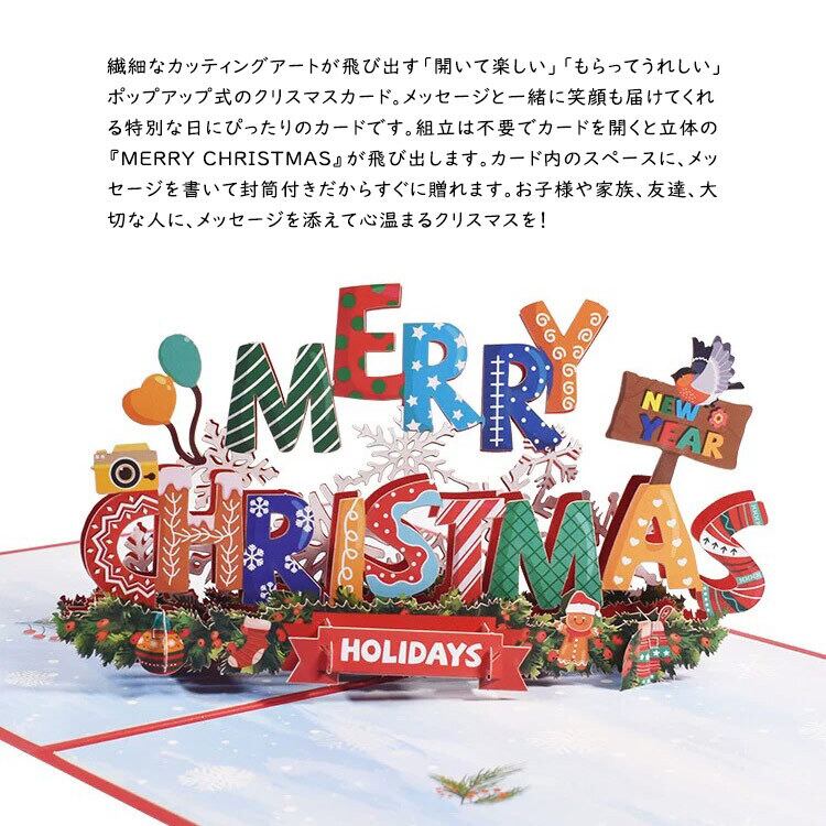 組立は不要でカードを開くと立体の『MERRY CHRISTMAS』が飛び出します。