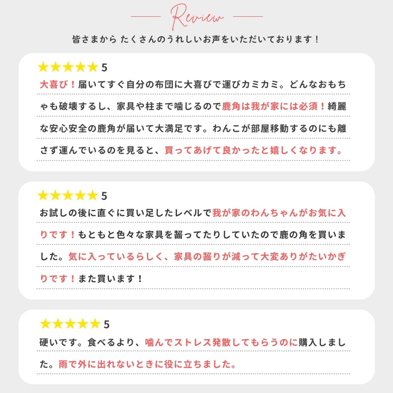 ● 来客時や、かまってあげることができない時に与えることで愛犬は鹿角に夢中!おとなしく一人遊びしてくれて助かります。